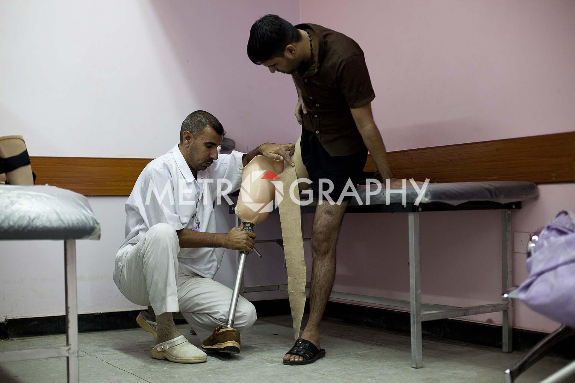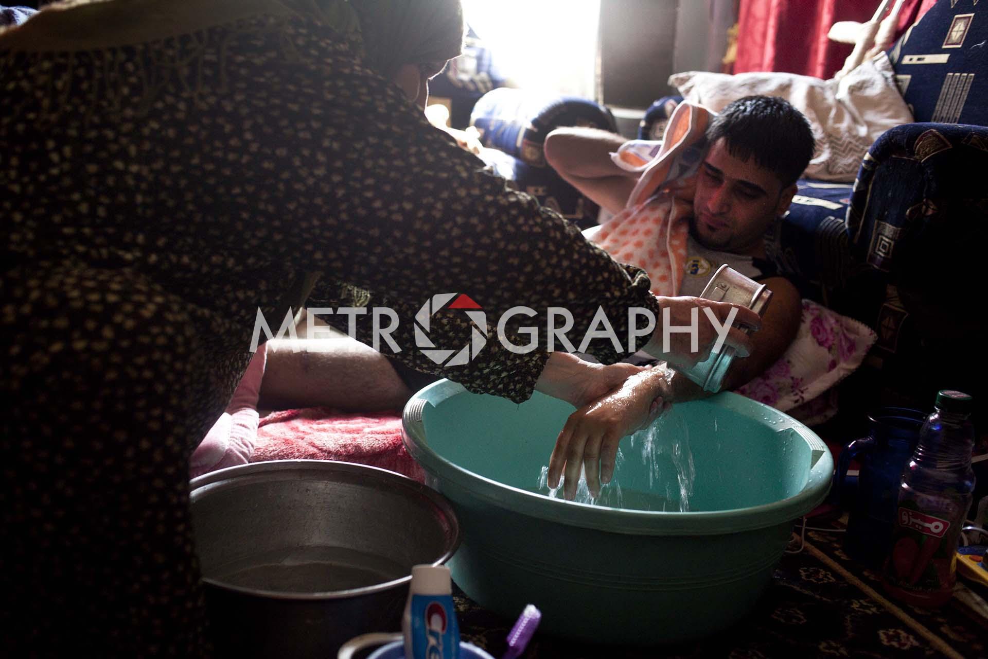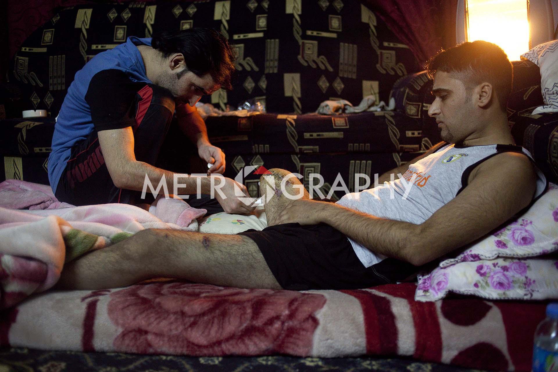 On January 22nd, 2012, an IED (Improvised Explosive Devise) detonated near an Iraqi Army base in Fallujah. Hussein Jamil Abdullah, a 28-year-old soldier from Baghdad was nearby when the explosive discharged, knocking him to the ground. Hey, lay there for half an hour, his right leg in a jerry-rigged tourniquet made from a headscarf, before he was taken to hospital. Gangrene set in almost immediately and the doctors at Fallujah General Hospital had to amputate his leg. He was then moved to Adnan Hospital, the military medical center, but the care Hussein received was terrible. His bandage wasn’t changed for two days and fearing that gangrene would set in a second time his family moved him to Kerkh Hospital, which they had to cover the costs themselves, as the army refused to pay. As soon as he was wounded, the Army cut Hussein’s salary in half: from $500 a month to $250, which is less than he can live on. His brother, Ali, has given up his work as a barber to take care of him, and his two other brothers, Abbas and Hassan, now take care of the family. Before he was wounded, Hussein, was to be engaged to his fiancée, Hind and he had even bought and furnished a room in preparation. But, after the explosion, Hind’s father refused to allow them to marry, saying that they can’t do so until Hussein gets a prosthetic leg. In the summer, a selection of photographs was published online and caught the attention of an NGO worker in Baghdad who arranged for Hussein to have a prosthetic leg fitted. Once he had his prosthetic leg, Hussein married Hind.