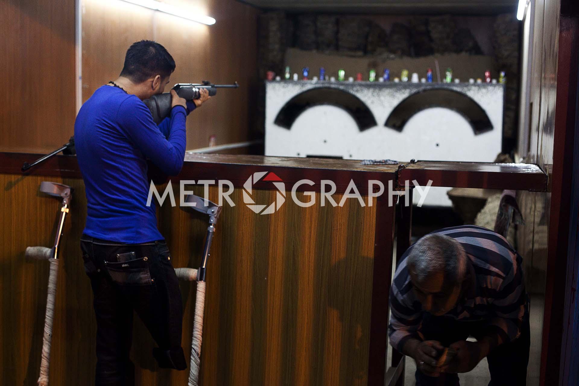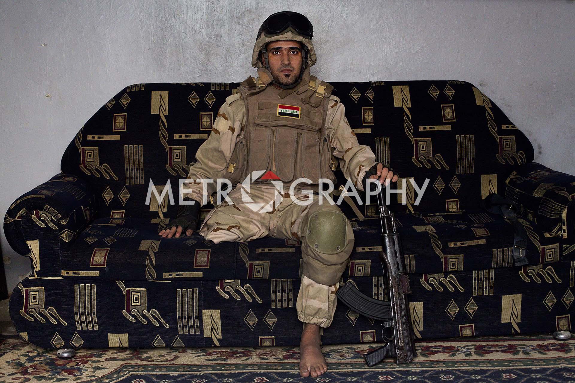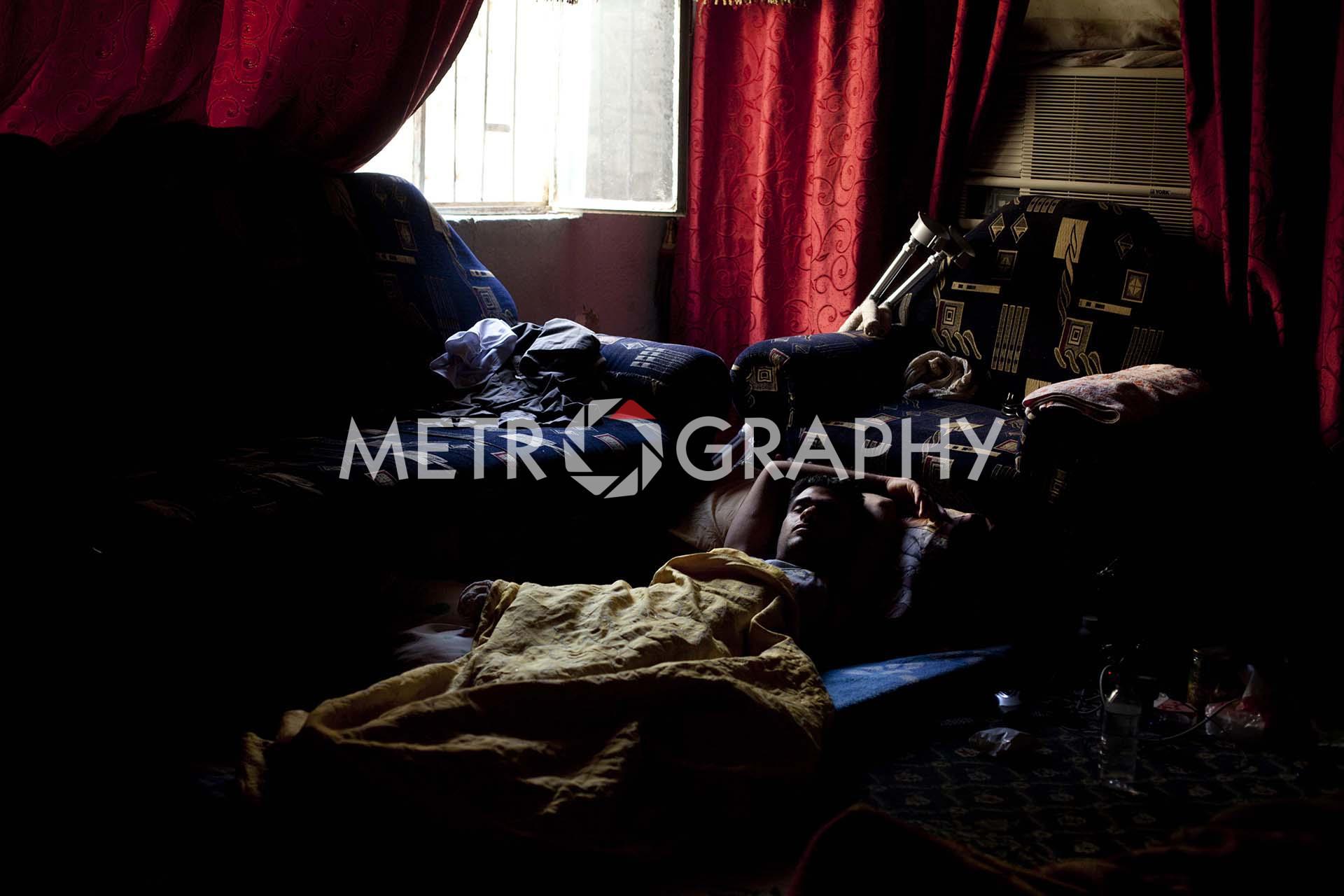 On January 22nd, 2012, an IED (Improvised Explosive Devise) detonated near an Iraqi Army base in Fallujah. Hussein Jamil Abdullah, a 28-year-old soldier from Baghdad was nearby when the explosive discharged, knocking him to the ground. Hey, lay there for half an hour, his right leg in a jerry-rigged tourniquet made from a headscarf, before he was taken to hospital. Gangrene set in almost immediately and the doctors at Fallujah General Hospital had to amputate his leg. He was then moved to Adnan Hospital, the military medical center, but the care Hussein received was terrible. His bandage wasn’t changed for two days and fearing that gangrene would set in a second time his family moved him to Kerkh Hospital, which they had to cover the costs themselves, as the army refused to pay. As soon as he was wounded, the Army cut Hussein’s salary in half: from $500 a month to $250, which is less than he can live on. His brother, Ali, has given up his work as a barber to take care of him, and his two other brothers, Abbas and Hassan, now take care of the family. Before he was wounded, Hussein, was to be engaged to his fiancée, Hind and he had even bought and furnished a room in preparation. But, after the explosion, Hind’s father refused to allow them to marry, saying that they can’t do so until Hussein gets a prosthetic leg. In the summer, a selection of photographs was published online and caught the attention of an NGO worker in Baghdad who arranged for Hussein to have a prosthetic leg fitted. Once he had his prosthetic leg, Hussein married Hind.
