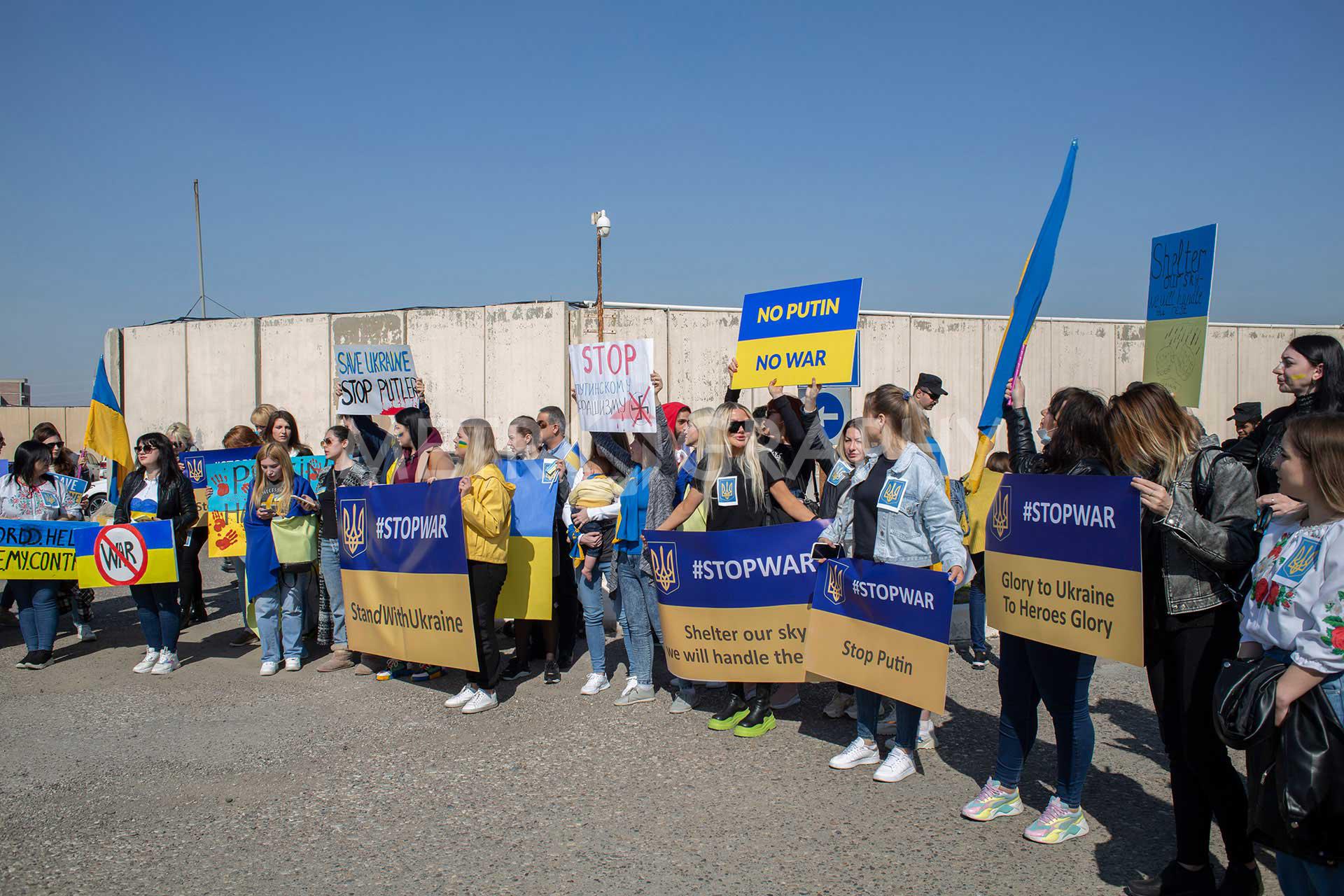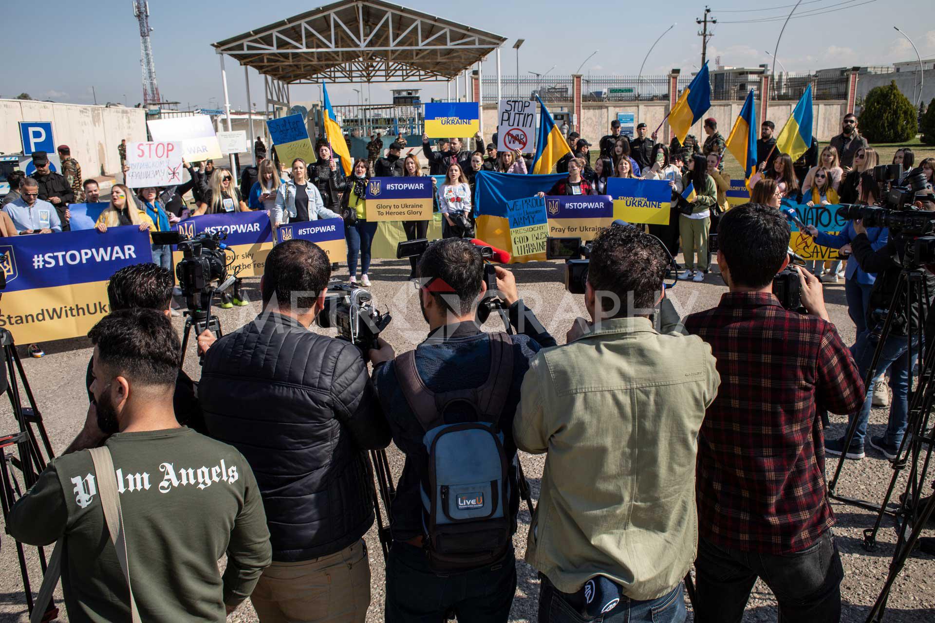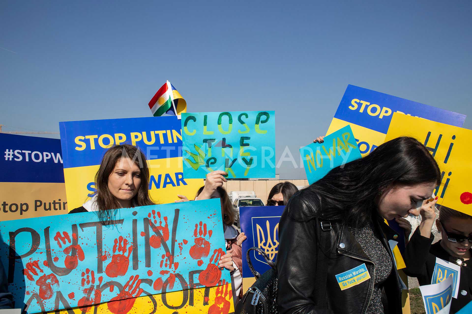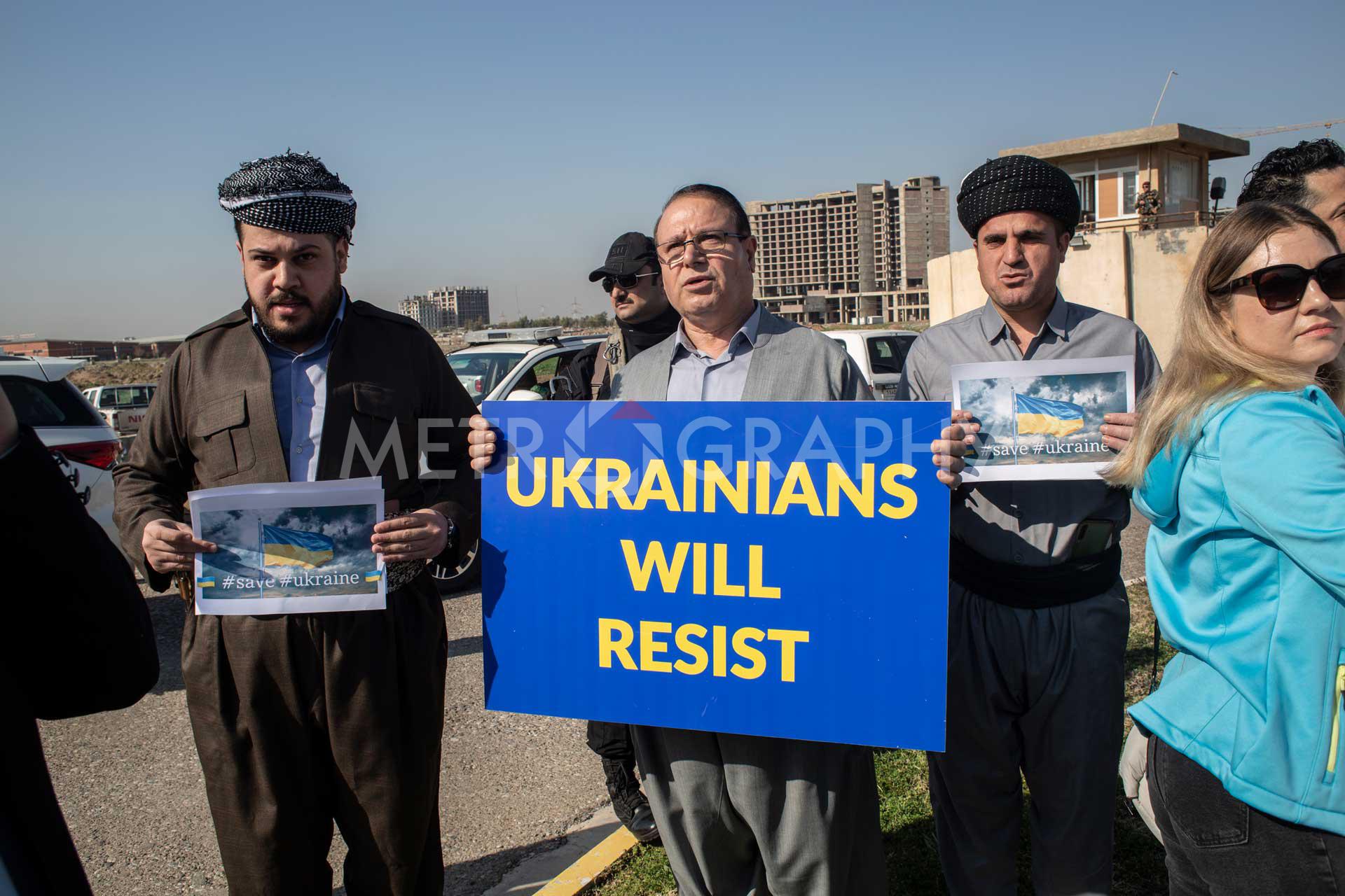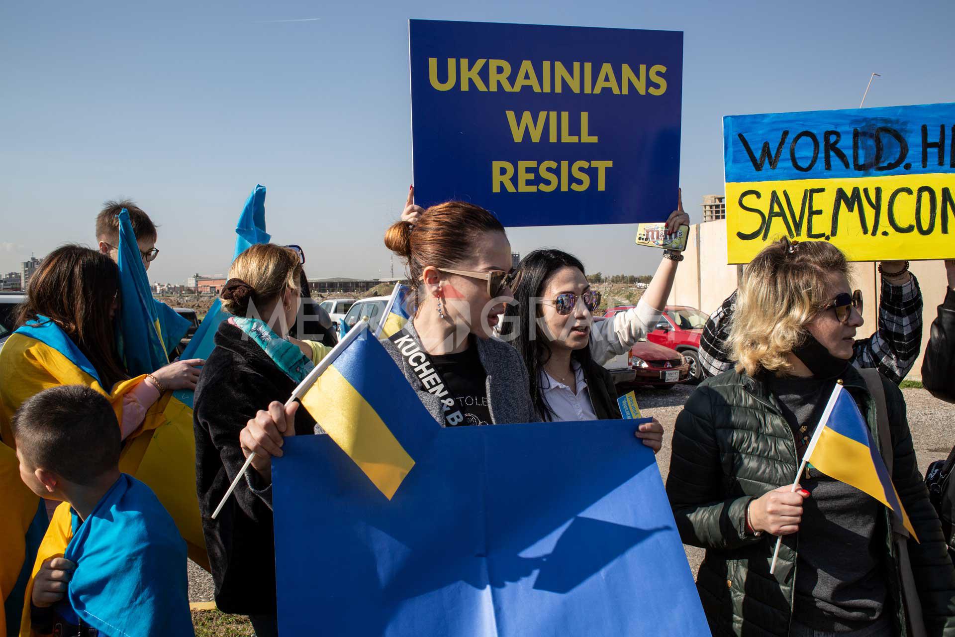 Protesters denounce Russia’s invasion of Ukraine and call for peace outside the UN headquarters in Erbil on February, 27, 2022. Three days earlier, Russian troops crossed into Ukraine on multiple fronts, including from areas it already occupied in Donbas and Crimea. Protests against the war began taking place across the world and Ukrainians were permitted to protest outside the UN headquarters in Erbil.