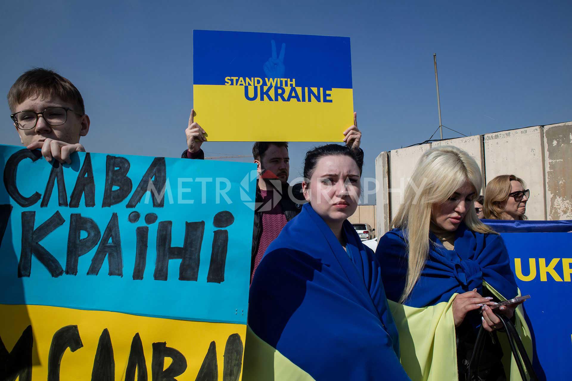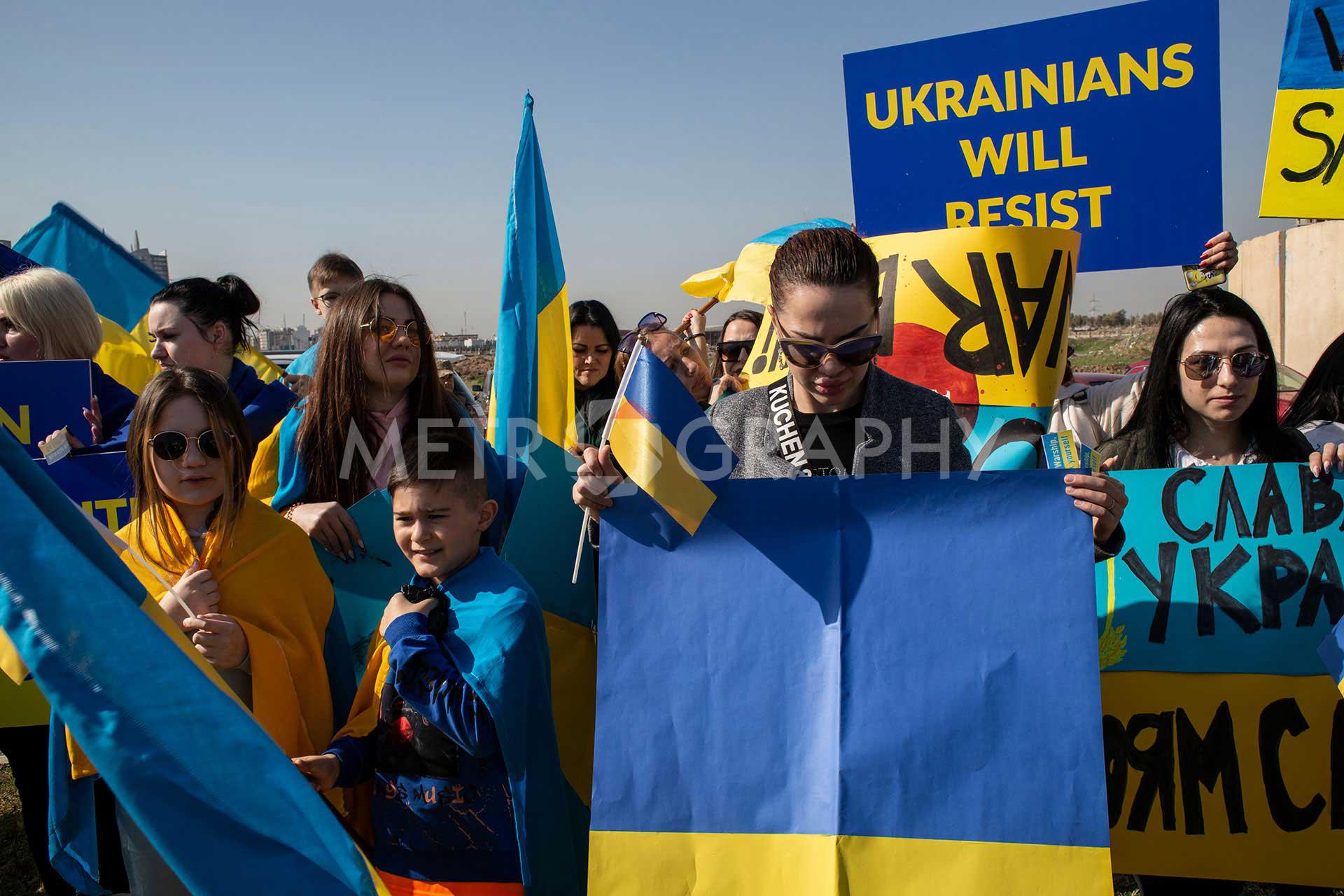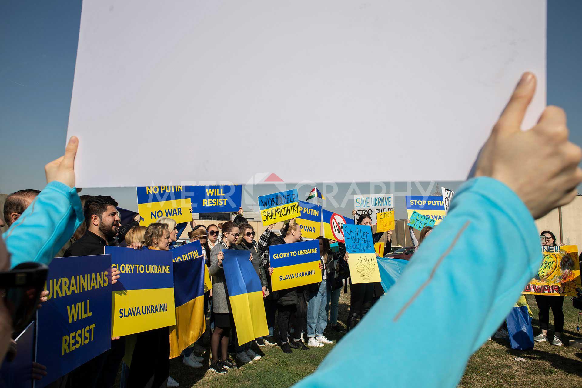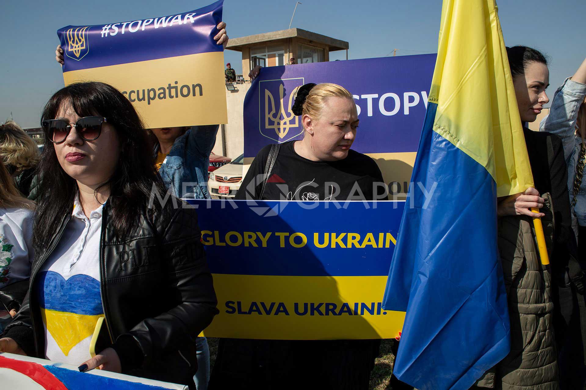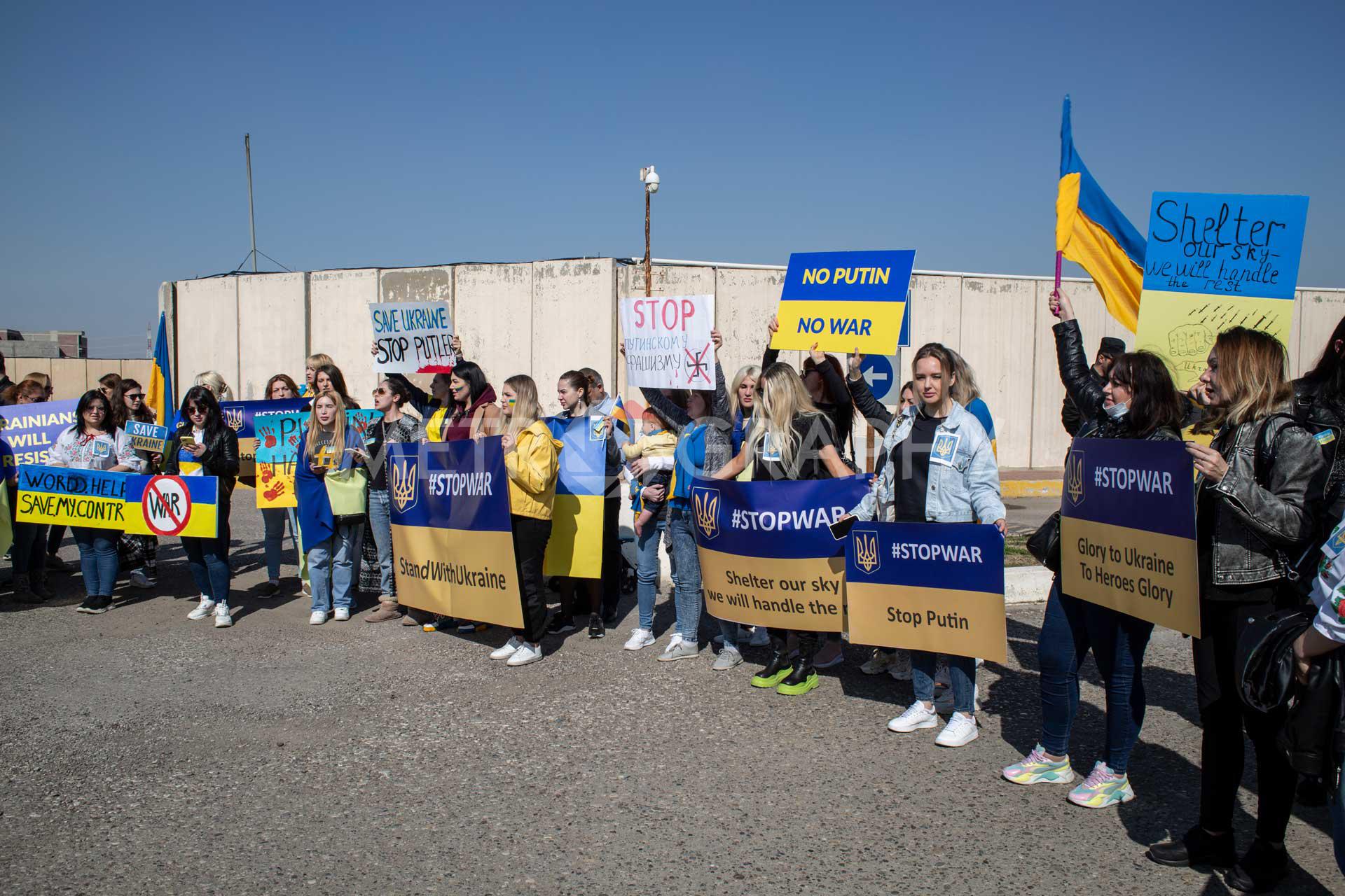 Protesters denounce Russia’s invasion of Ukraine and call for peace outside the UN headquarters in Erbil on February, 27, 2022. Three days earlier, Russian troops crossed into Ukraine on multiple fronts, including from areas it already occupied in Donbas and Crimea. Protests against the war began taking place across the world and Ukrainians were permitted to protest outside the UN headquarters in Erbil.