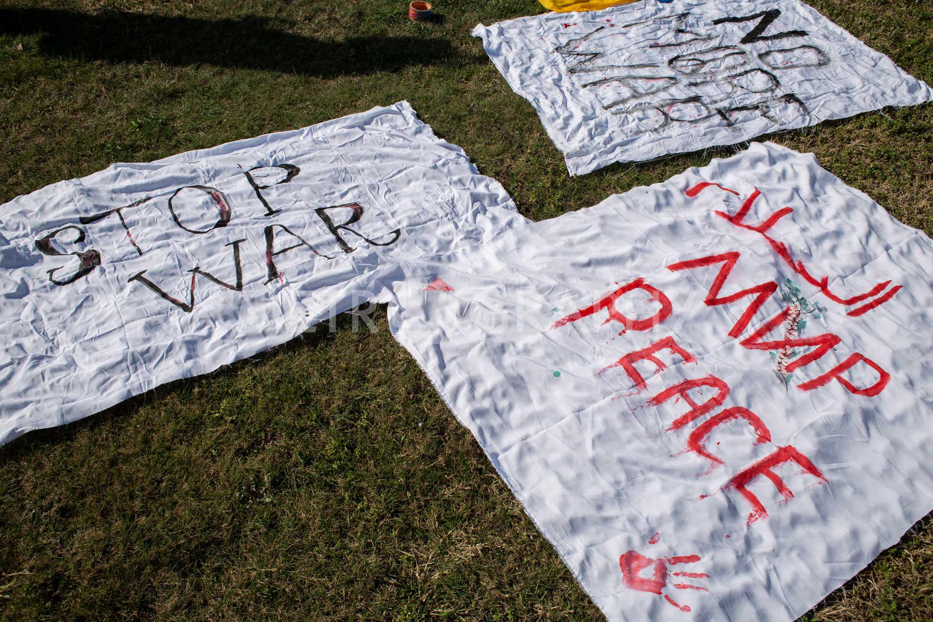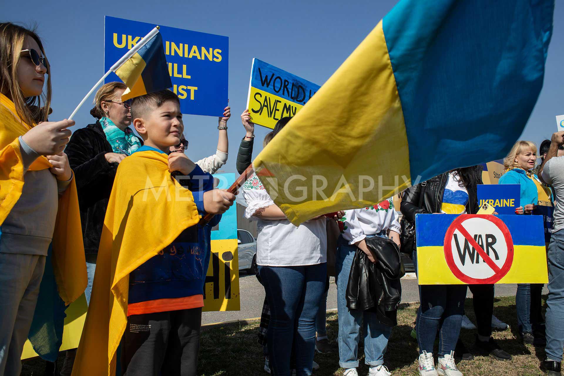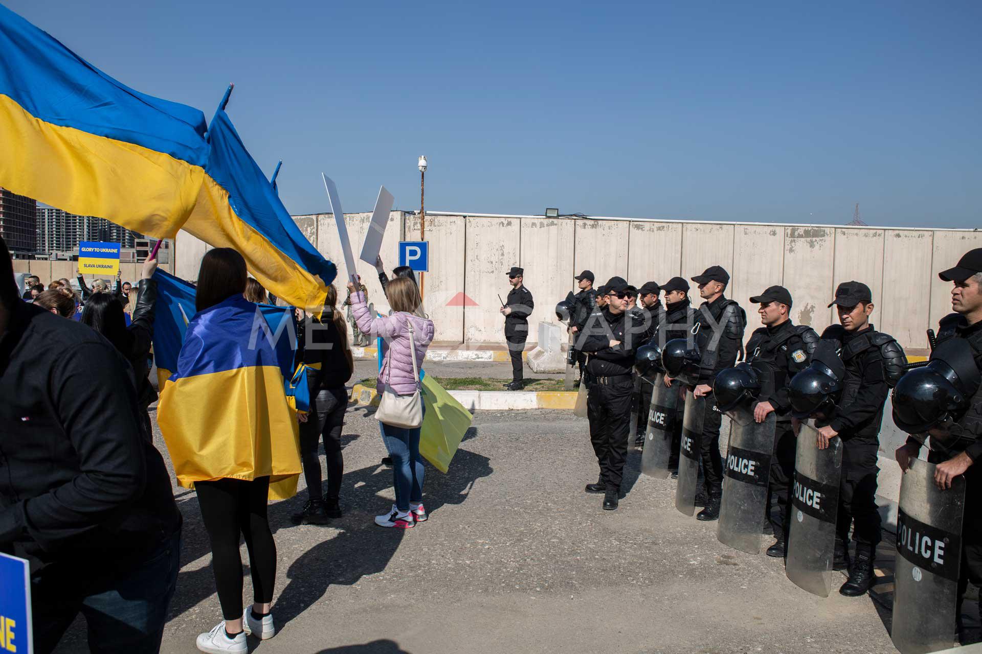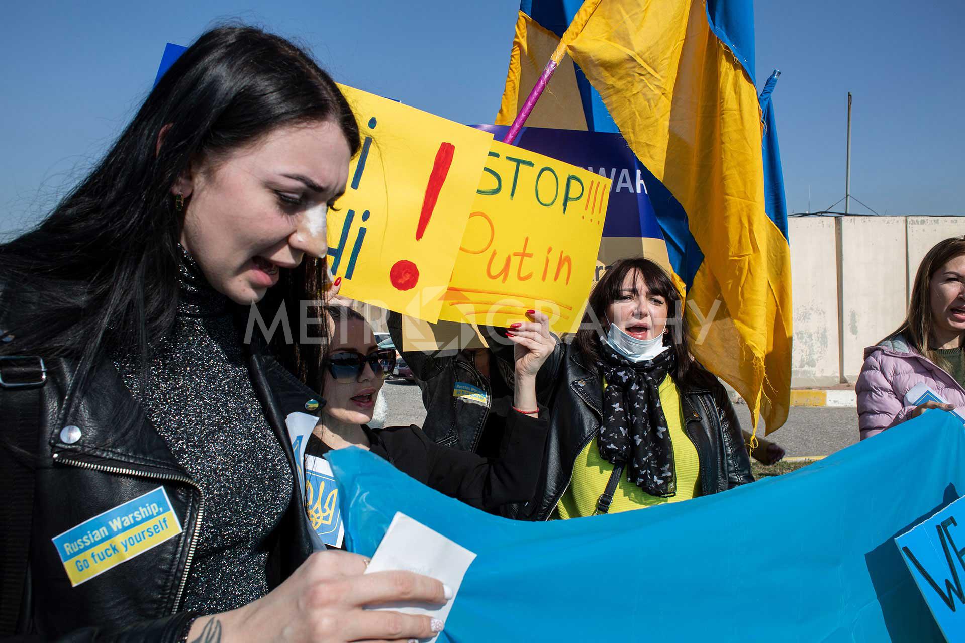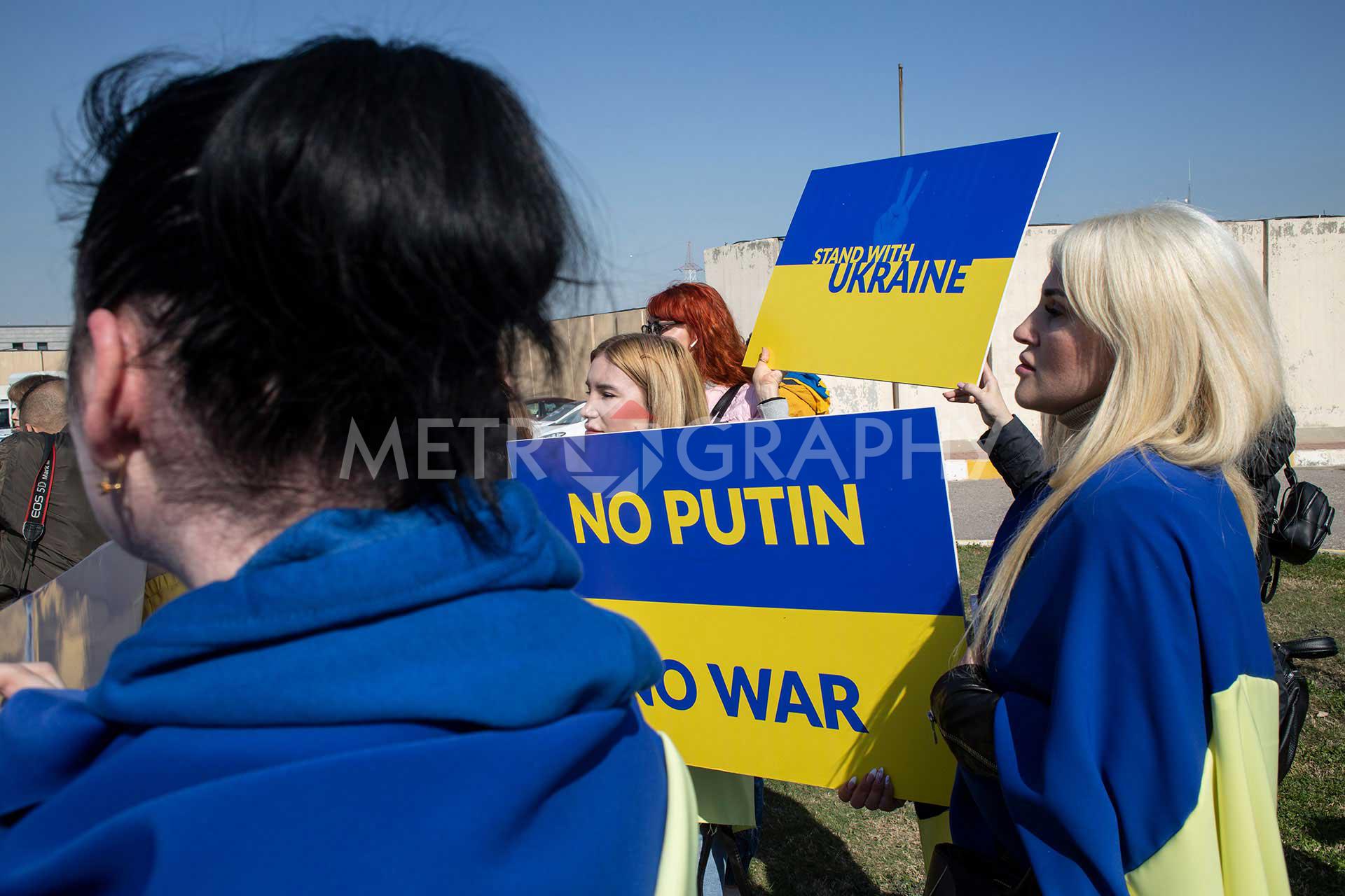 Protesters denounce Russia’s invasion of Ukraine and call for peace outside the UN headquarters in Erbil on February, 27, 2022. Three days earlier, Russian troops crossed into Ukraine on multiple fronts, including from areas it already occupied in Donbas and Crimea. Protests against the war began taking place across the world and Ukrainians were permitted to protest outside the UN headquarters in Erbil.