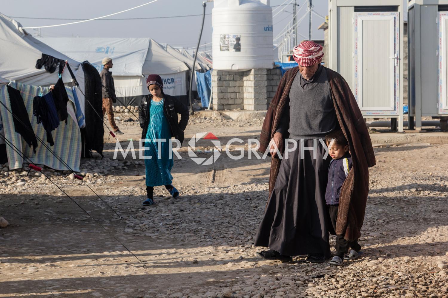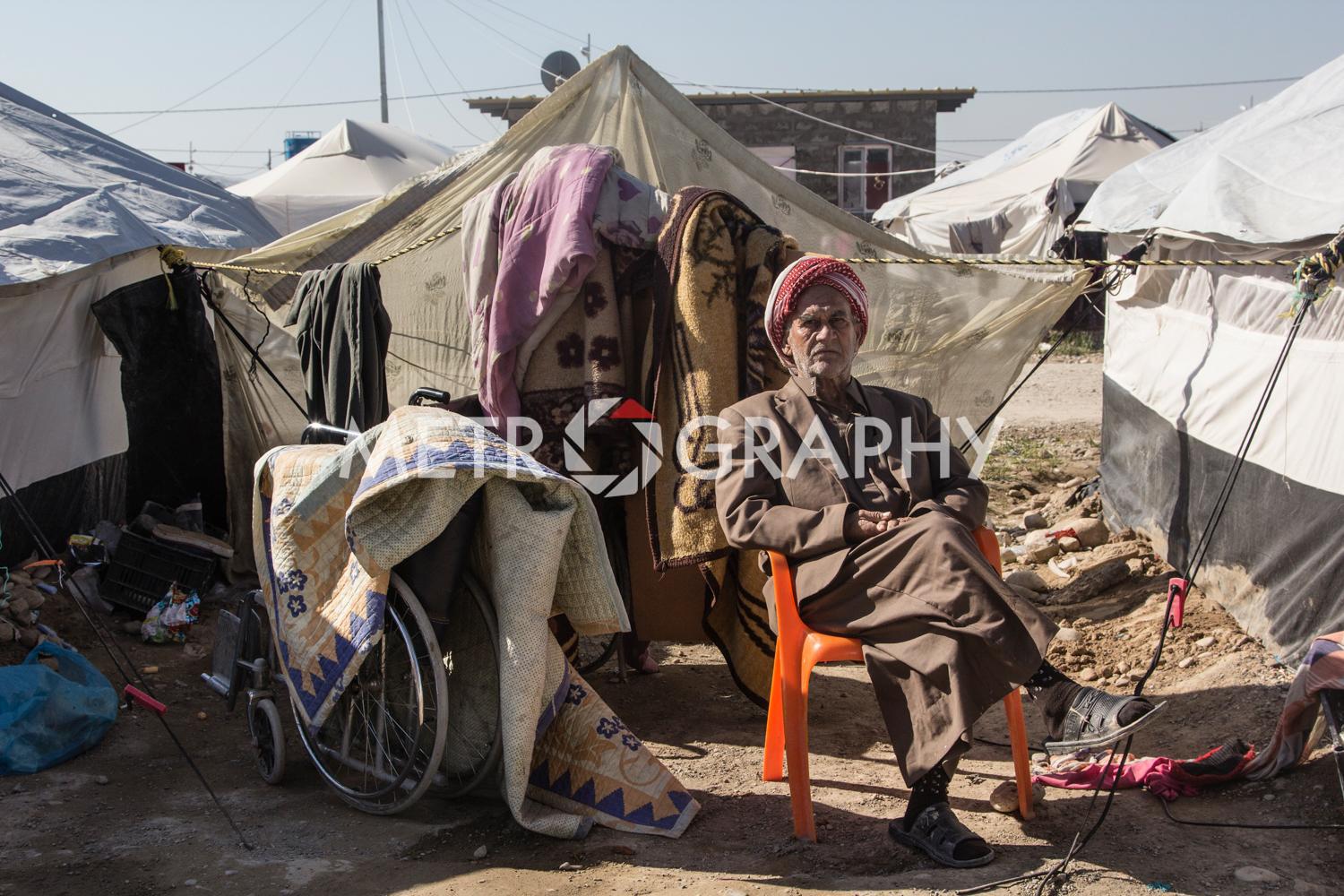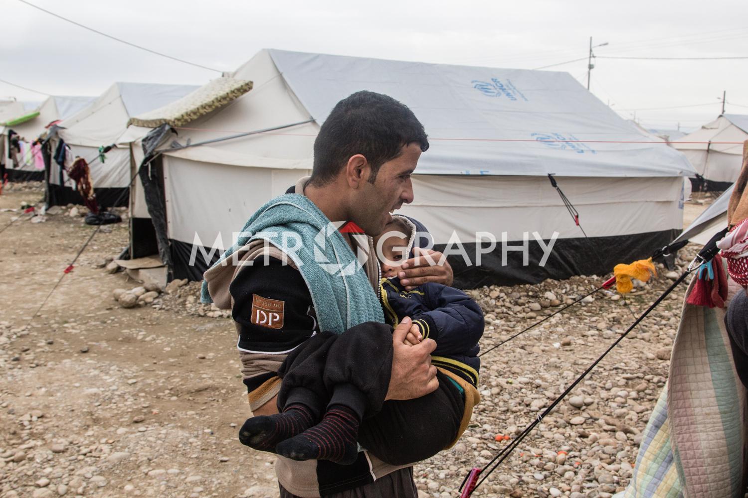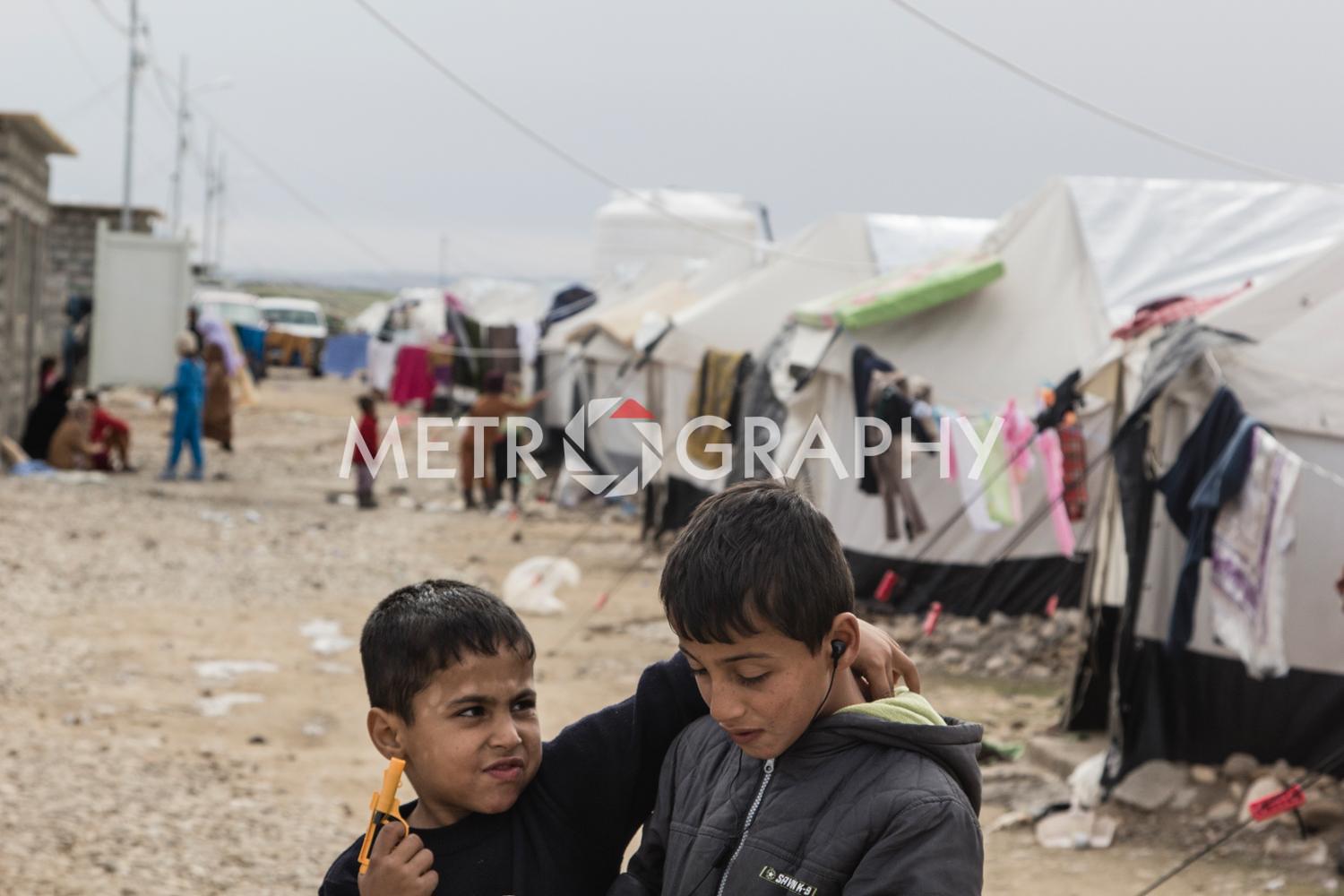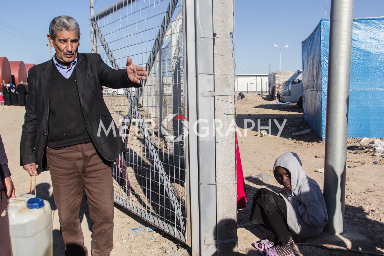 By a cluster of tents, teenagers gather to watch Marwan carefully razor marine cuts in his makeshift barbershop. No teenager here wants to be mistaken for a ‘Daesh’ member. Not far away Adem’s children are playing with stones as he looks on worriedly, he is Sudanese and name-calling because of their black skin is common. Adem came to Iraq to avoid civil war and poverty but didn’t expect his adopted home town of Tikrit to be overrun by ISIS. Across the camp in Sulaiman’s tent, the mood is somber. Hazar lays out the ID cards that belonged to his dead children. They were killed by aerial bombardment. “We put a white flag on our convoy of cars to show we are civilians,” he says, dejectedly. They were also denied entry to relatively safe Kurdistan, as Sunni Arabs the Kurds view them as possible ISIS infiltrators.