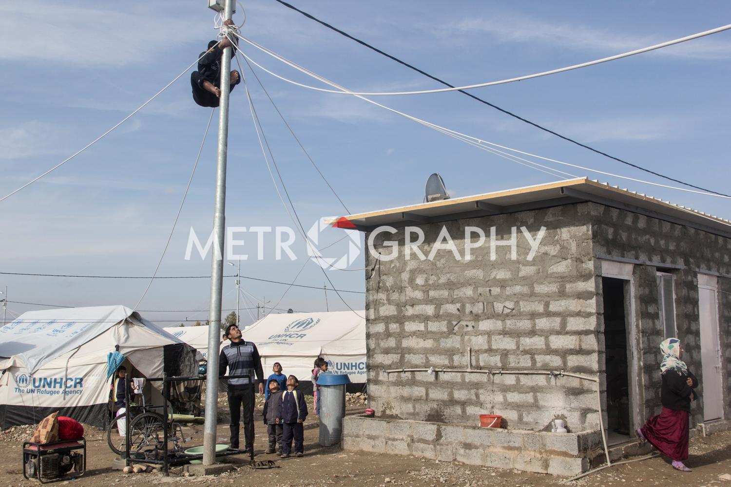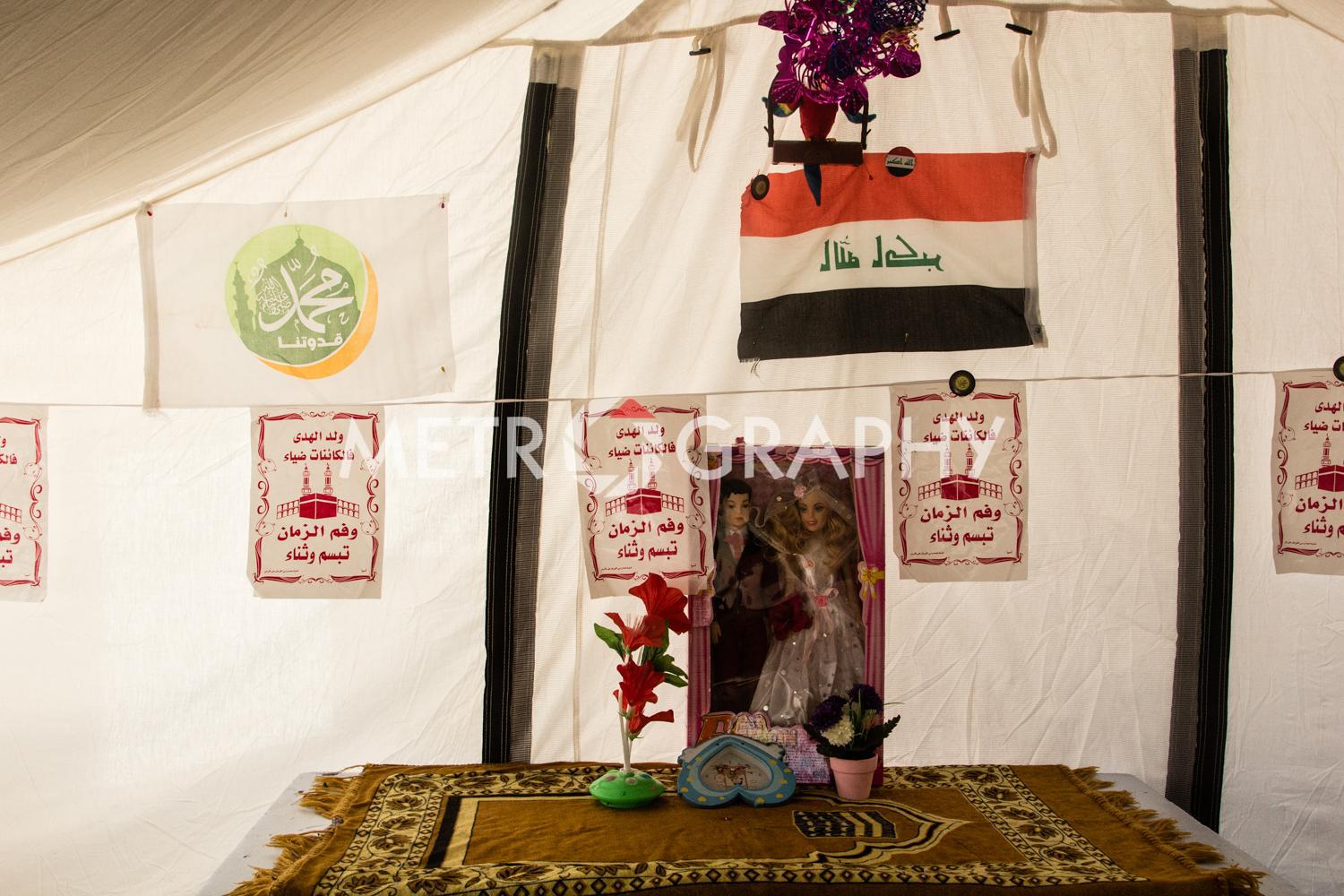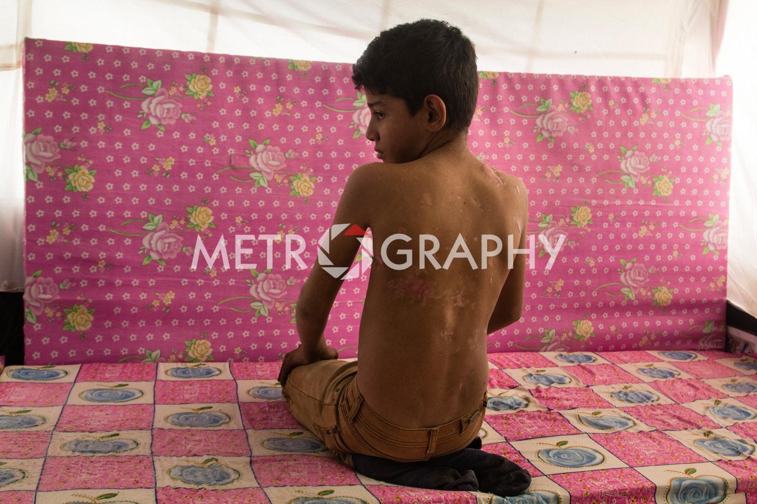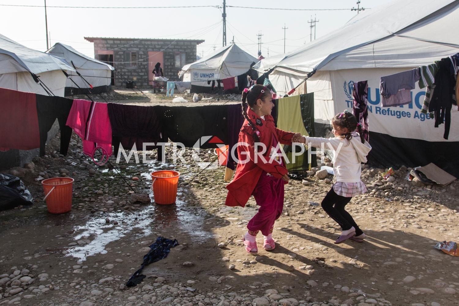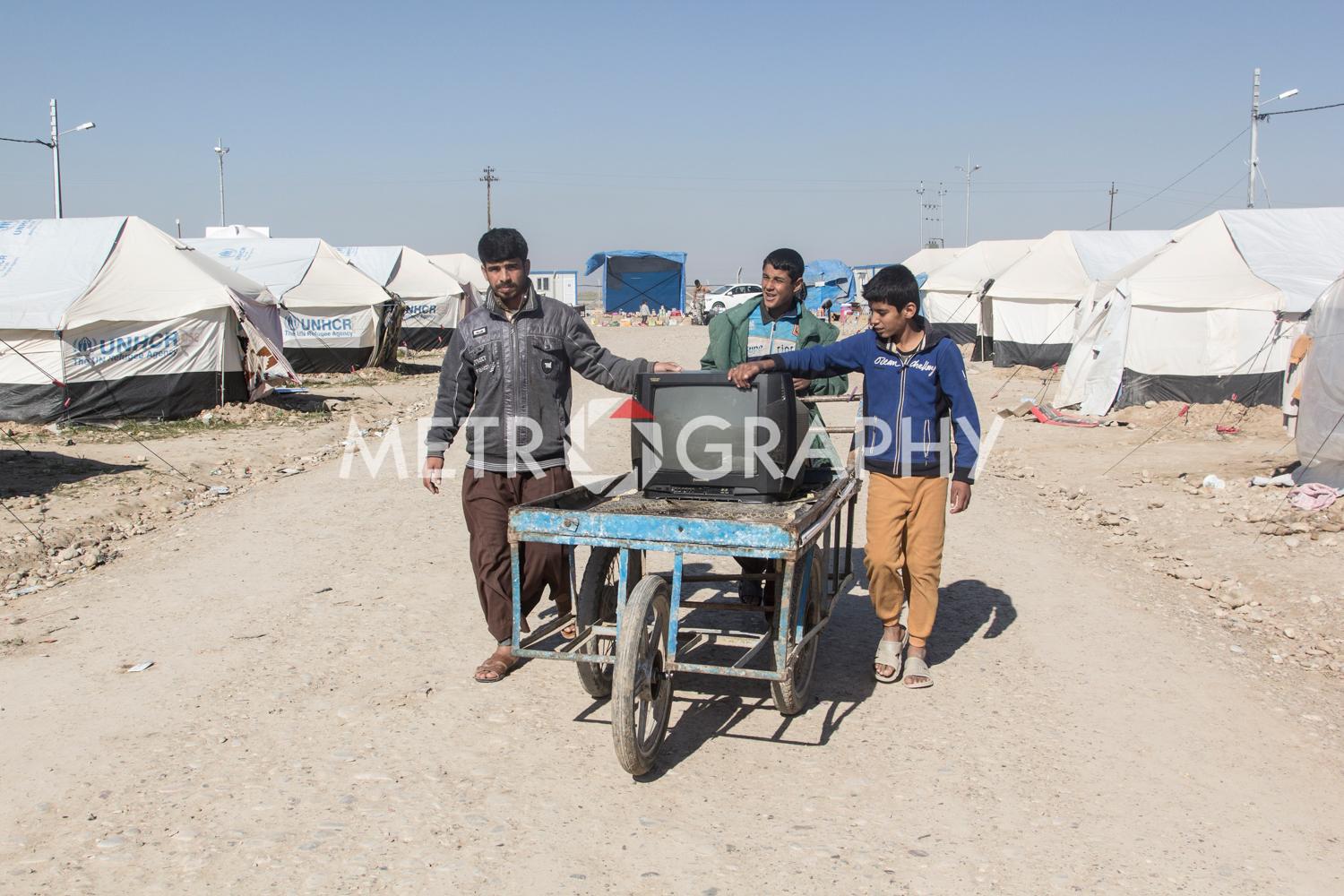 By a cluster of tents, teenagers gather to watch Marwan carefully razor marine cuts in his makeshift barbershop. No teenager here wants to be mistaken for a ‘Daesh’ member. Not far away Adem’s children are playing with stones as he looks on worriedly, he is Sudanese and name-calling because of their black skin is common. Adem came to Iraq to avoid civil war and poverty but didn’t expect his adopted home town of Tikrit to be overrun by ISIS. Across the camp in Sulaiman’s tent, the mood is somber. Hazar lays out the ID cards that belonged to his dead children. They were killed by aerial bombardment. “We put a white flag on our convoy of cars to show we are civilians,” he says, dejectedly. They were also denied entry to relatively safe Kurdistan, as Sunni Arabs the Kurds view them as possible ISIS infiltrators.